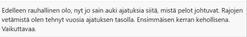 - "Edelleen rauhallinen olo, nyt jo sain auki ajatuksia siitä, mistä pelot johtuvat."
